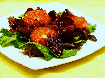 To serve, place the baby salad leaves in a serving bowl. Cut the beetroot into chunks and nestle them in the salad leaves. Cut the peel from the oranges, cut out the segments and add them to the salad, then scatter over the pomegranate seeds and red onion slices. Finally, drizzle with some of the dressing, serve the rest separately, and then scatter with the mint and coriander leaves.