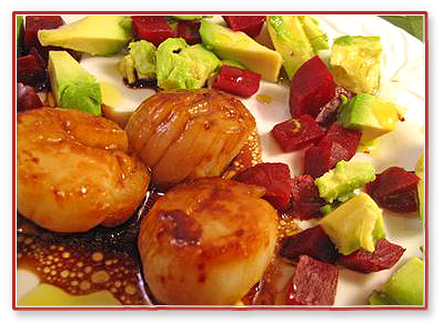 To serve: Divide the scallops and place in the center of 2 plates. Arrange the avocado and beet cubes around the scallops. Drizzle Balsamic vinegar and truffle or olive oil over all and serve.